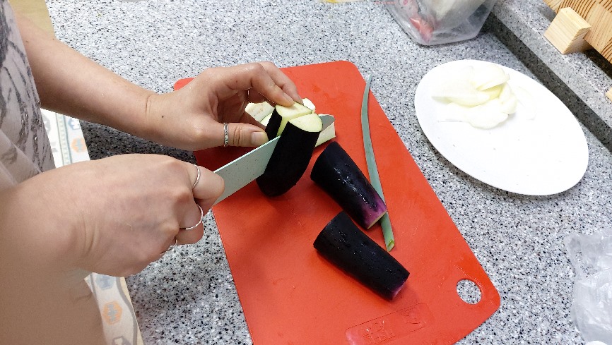 2. 가지는 길죽한 크기로 잘라 찜통에 넣고 쪄줍니다.