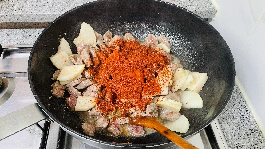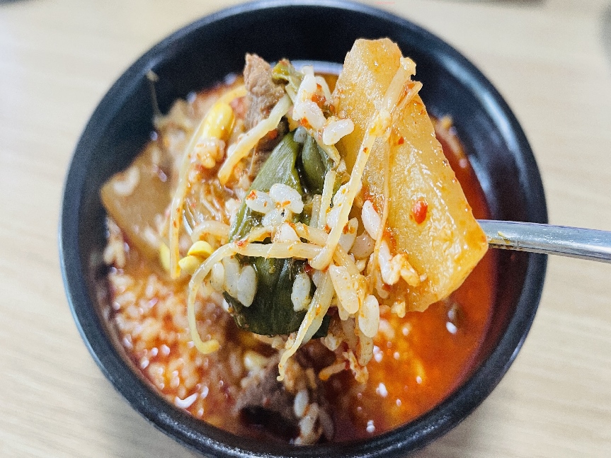 - After stir-frying the meat, add the prepared radish and fine red pepper powder, stir-fry it once more, then add the prepared bean sprouts and garlic, add 1.5 liters, and bring to a boil.