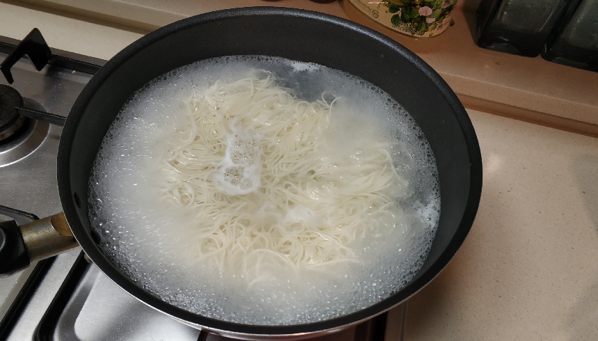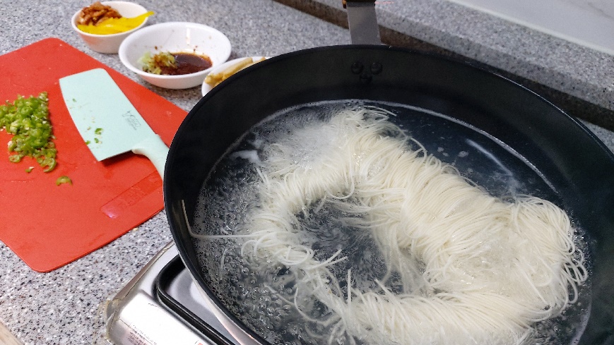 01. 펄펄 끓는 물(수)에 소면을 펼쳐 넣고 적당히 삶는다.