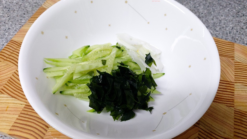 03. Put cucumber and sugar/salt/vinegar/red pepper powder in a bowl and pickle a little of the cucumber prepared above.