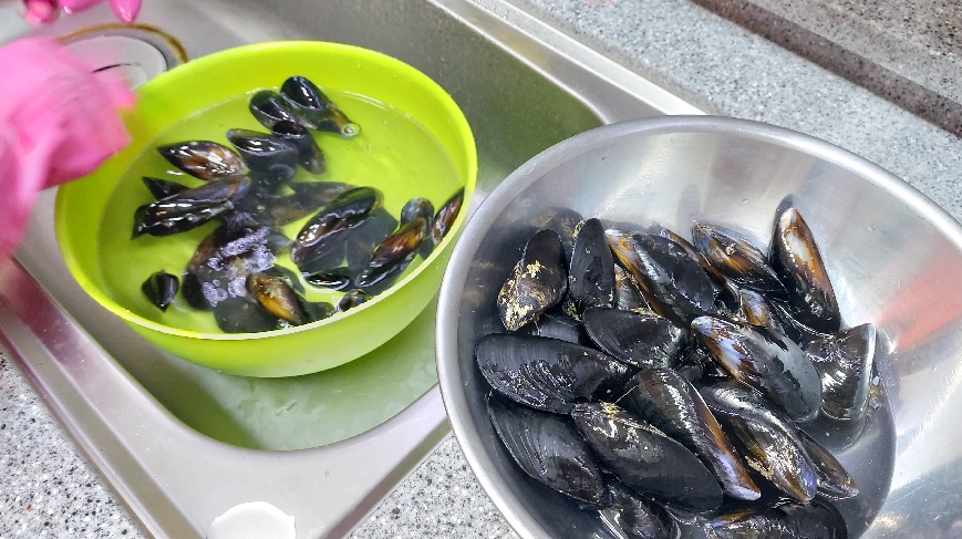 2. Rub the mussels thoroughly in running water to clean the dirty parts of the shell.