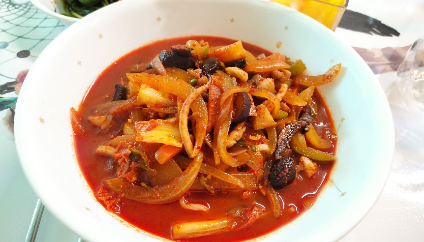 Cooking ingredients - Pepper to your liking, Red pepper powder 3 Tbsp, Cheongyang vinegar 3ea, Chicken stock, Carrot appropriate amount, Cooking oil (lard) 3Tbsp, Pumpkin appropriate amount, 1 Onion, 1 Tbsp minced garlic, 1 Tbsp Oyster sauce, 1 Squid Horses, 1500ml water, 3 tablespoons red pepper oil, beef bone powder, 2 handfuls of mussels, 12 shrimps, 2 green onions, 5 cabbage leaves (add or subtract according to your taste)