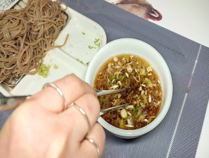 1. 쯔유와 물를 2:3정도의 량으로로 섞어 모밀국수 육수를 만든후 차가워 지도록 냉동실에 넣어둡니다.